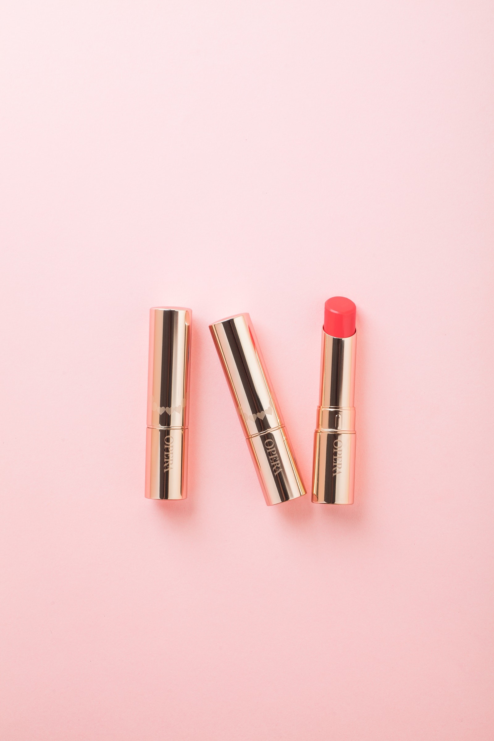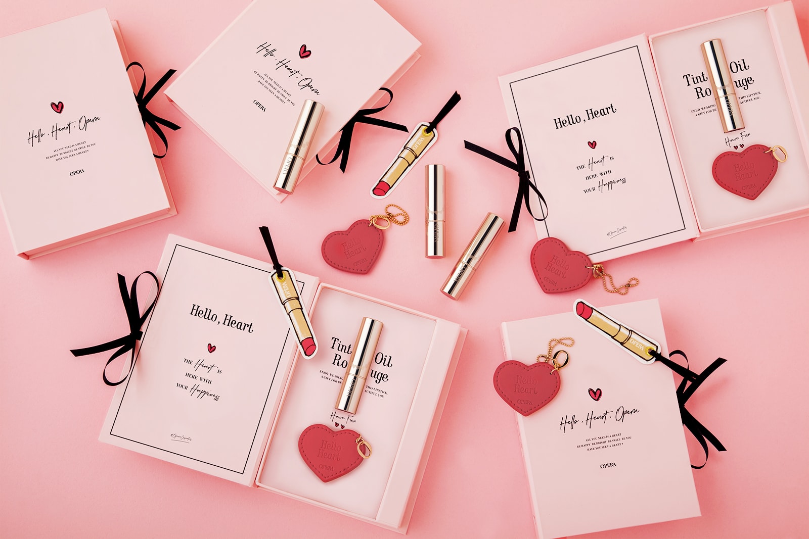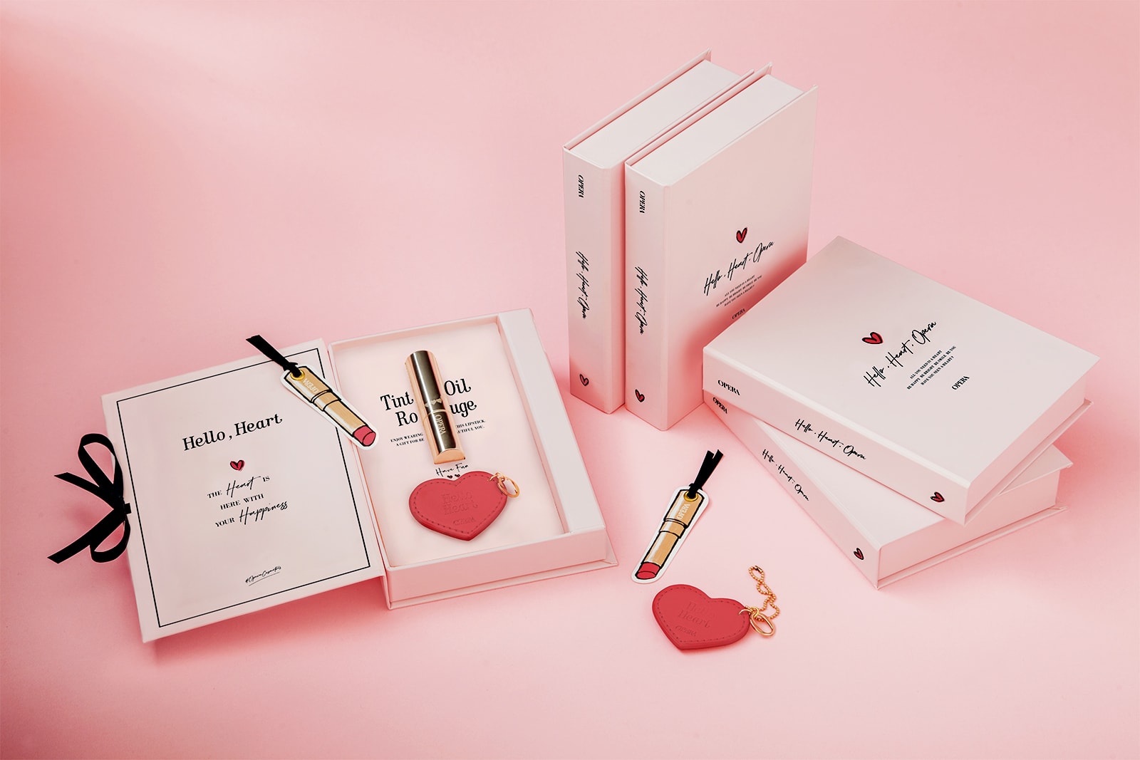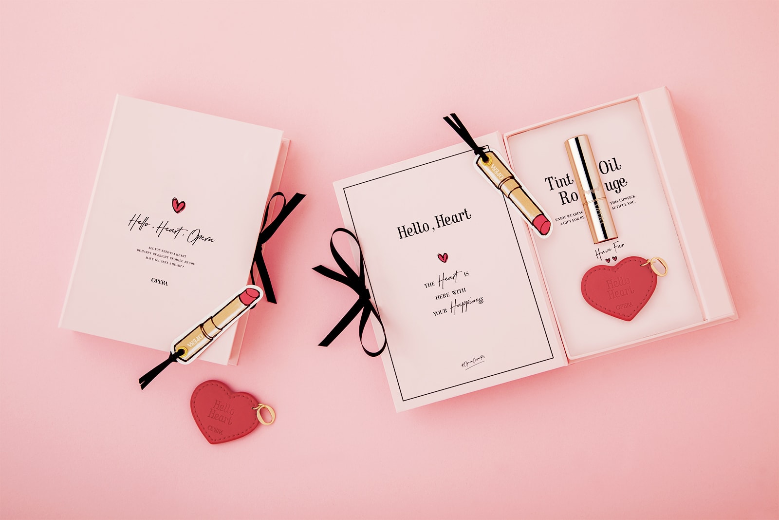 リップティントで知られるコスメブランド「OPERA(オペラ)」のビジュアルディレクションを担当。バレンタイン企画「#ハートをみつけて」をキーワードにビジュアルを展開し、ハート刻印入りのリップを数量限定で販売。限定ボトルの入ったブック型ボックスやその中に入るハート形のミラーを制作。