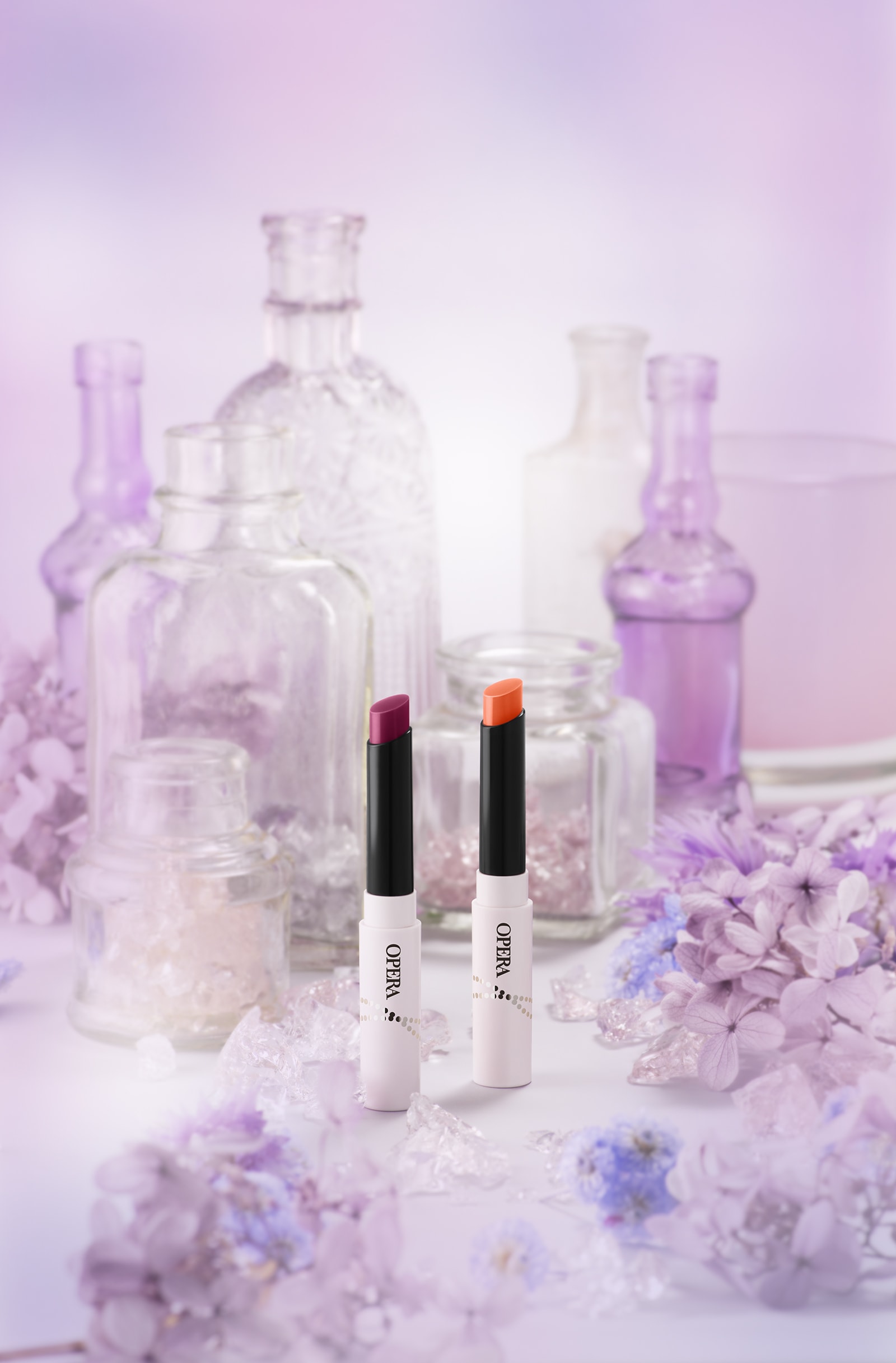 リップティントで知られるコスメブランド「OPERA(オペラ)」の限定色発売に合わせたビジュアルディレクション。「Clear Cassis」「Milky Coral」の2つのニュアンスカラーを、それぞれ淡く冷たい紫と柔らかいオレンジの光で季節の間の、曖昧で不思議な世界観を表現。テーマロゴは手書きを文字を採用しOPERAらしい抜け感を演出した。